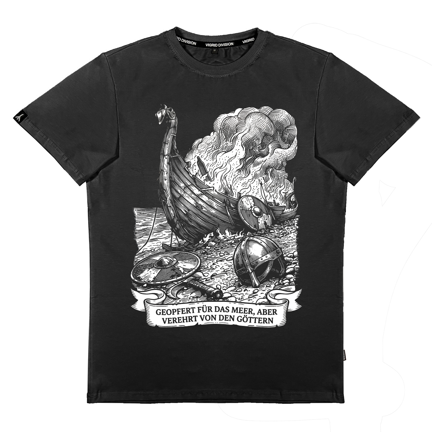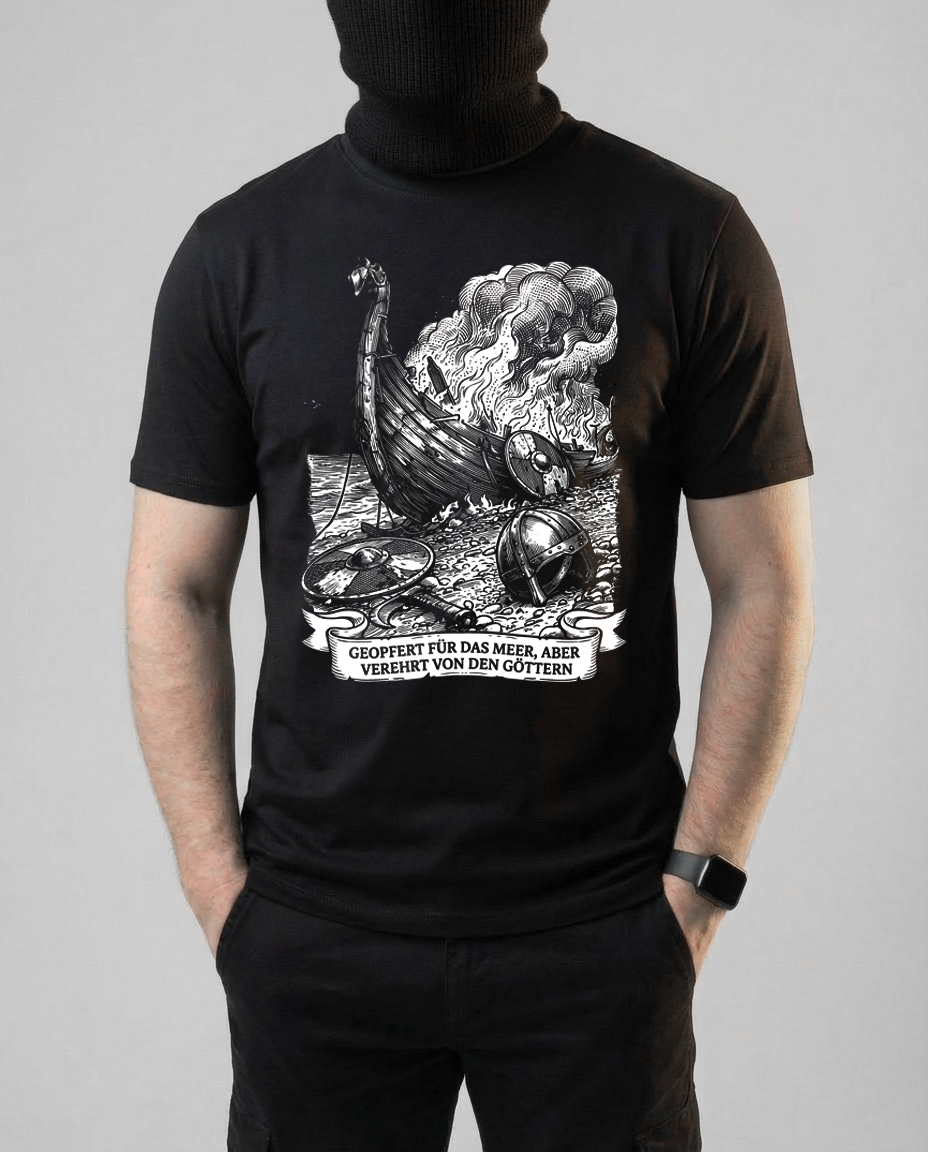 Принт повествует нам, что не каждая вылазка заканчивается победой. Перевод фразы звучит как "принесенный в жертву морю, но почитаемый богами"