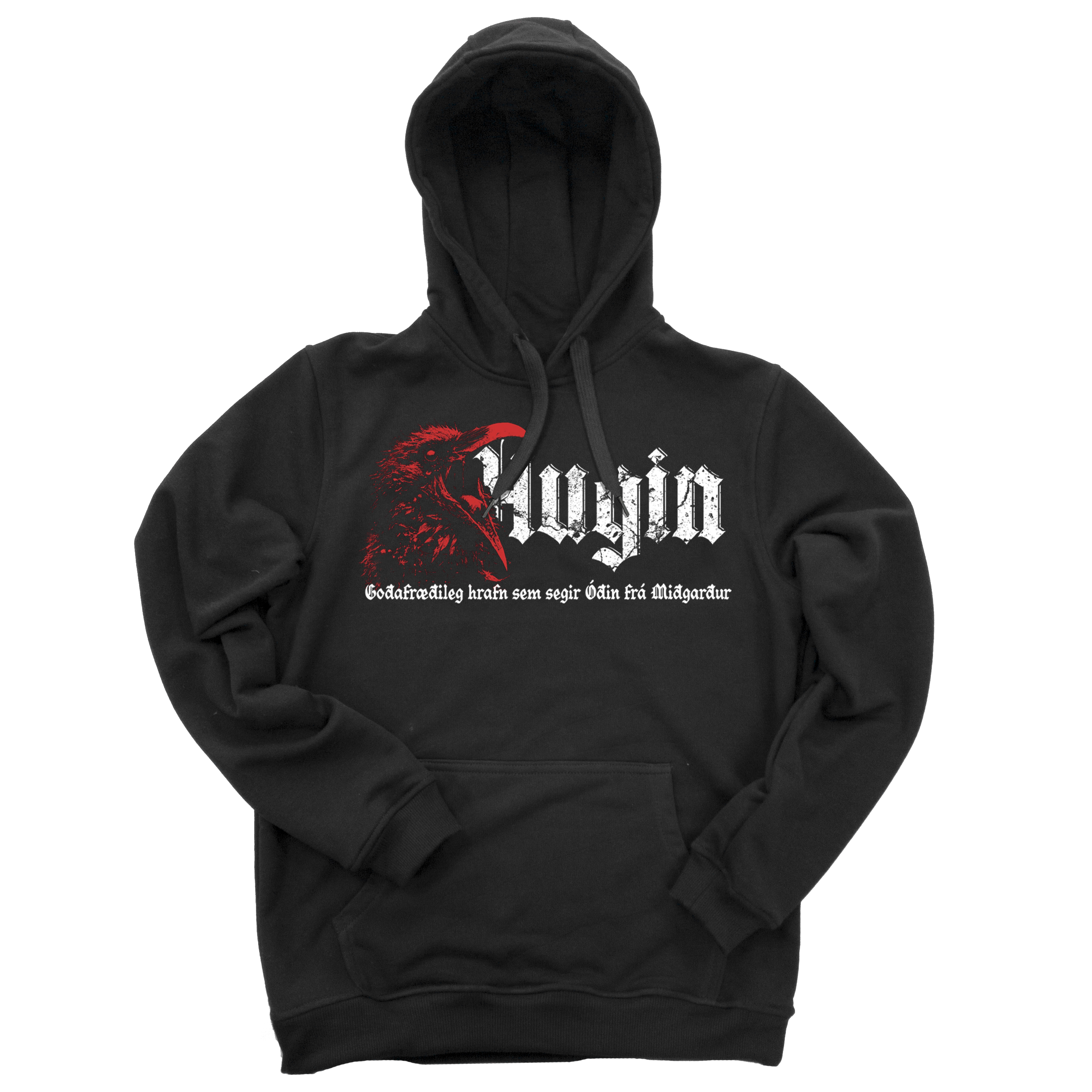 На толстовке изображен один из воронов Одина, который летает в Мидгарде, узнает новости и рассказывает их Одину.
