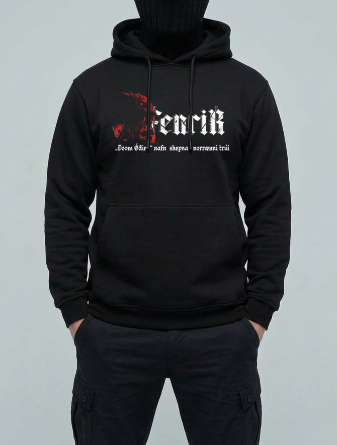 Принт олицетворяет мифологического волка Фенрира, который убьет Одина в последней битве. Надпись на исландском гласит - "Погибель Одина от мифического волка"