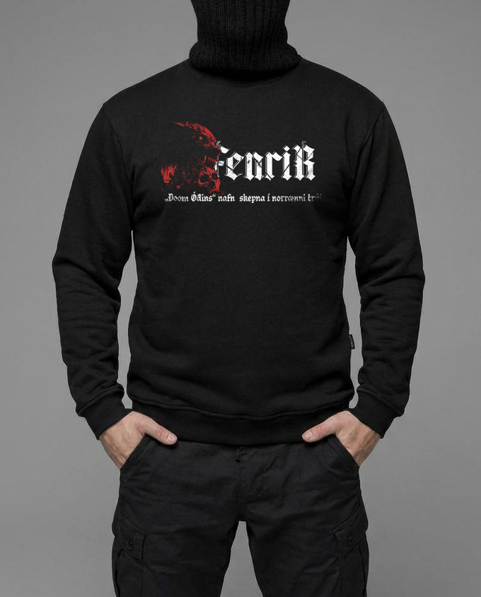 Принт олицетворяет мифологического волка Фенрира, который убьет Одина в последней битве. Надпись на исландском гласит - "Погибель Одина от мифического волка"